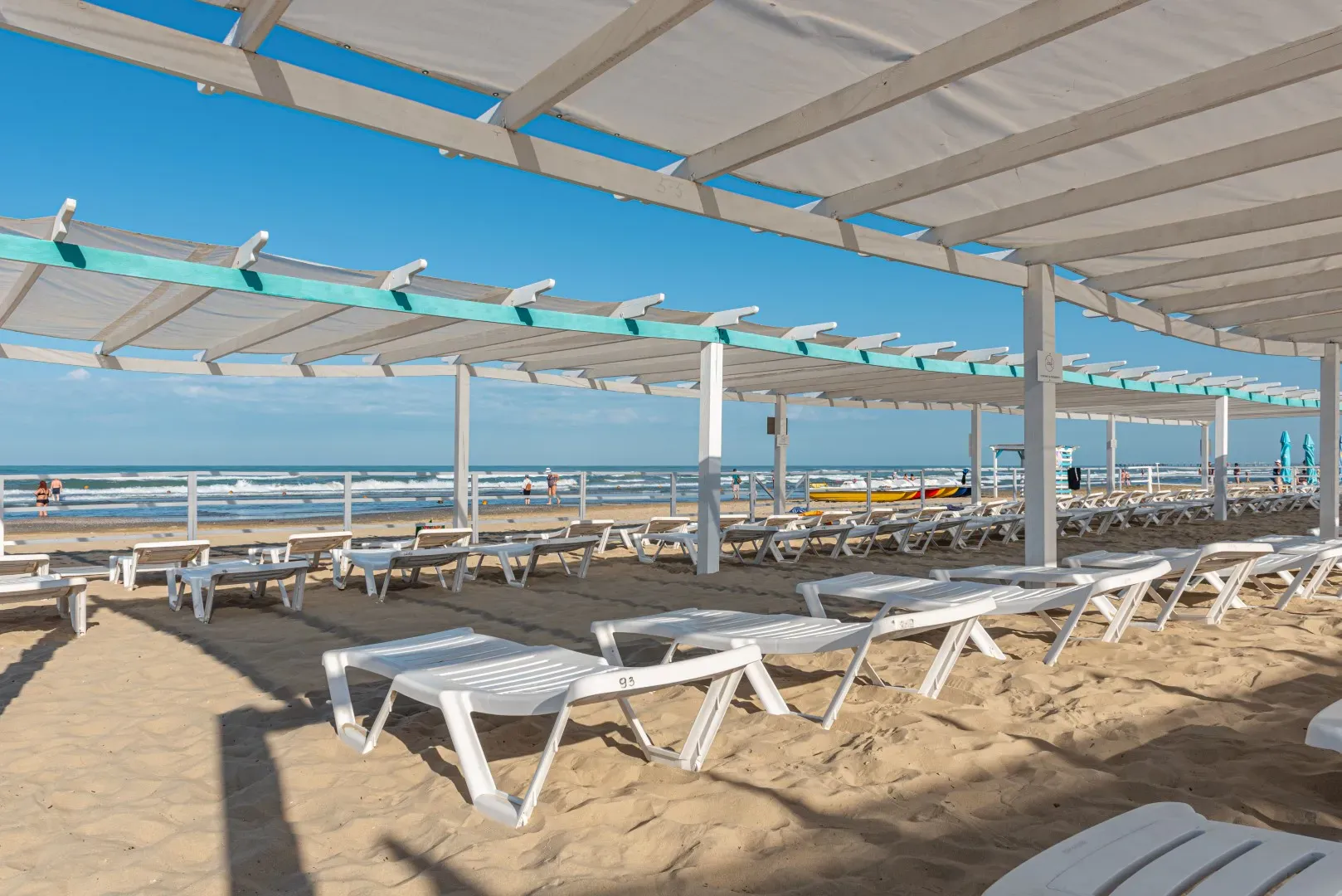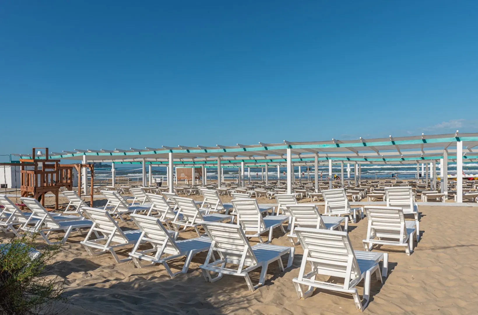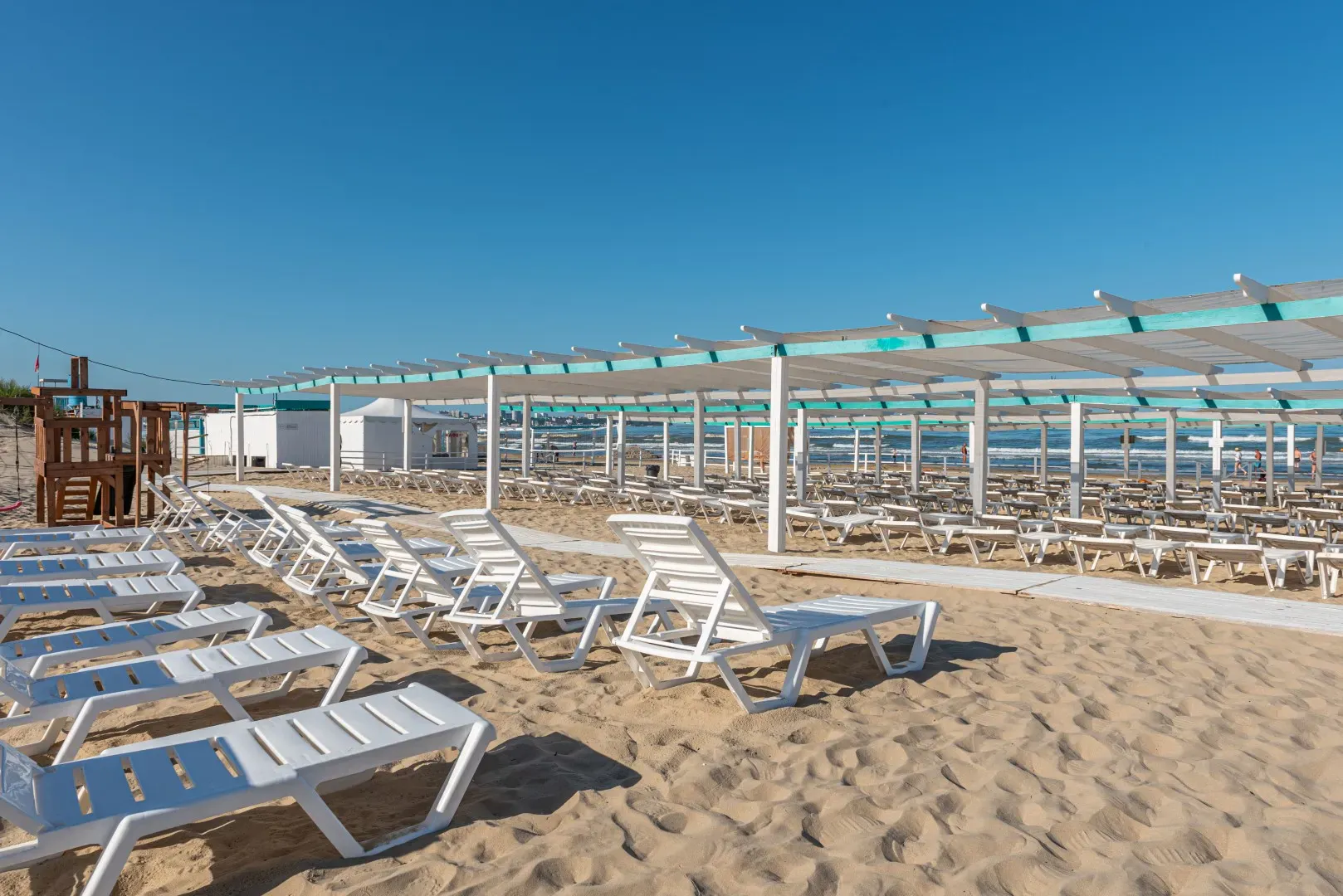 Пляж курорта Alean Club Majestic имеет собственную систему охраны. Пляж полностью оборудован для гостей, на территории имеются лежаки под навесами, раздевалки, пункт выдачи полотенец, душ и туалеты. Для безопасности отдыхающих работают спасательный и медицинский посты.